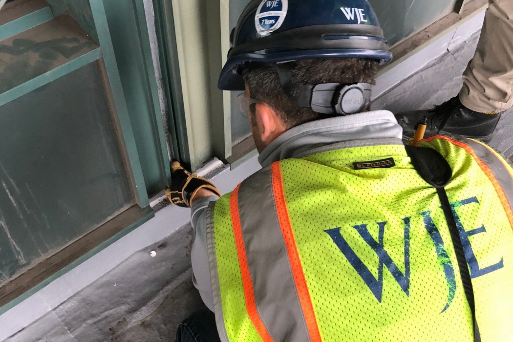 WJE performed a close-range survey and assessment of representative sections of the above-grade exterior wall and roof systems and assemblies in support of the ongoing cleaning and refurbishment. Material samples were removed during the survey for laboratory analysis. In addition, WJE performed mock-up in situ cleaning studies to identify the most responsive method of cleaning for the stone veneer, painted metal framing, spandrel panels, and glass surfaces.