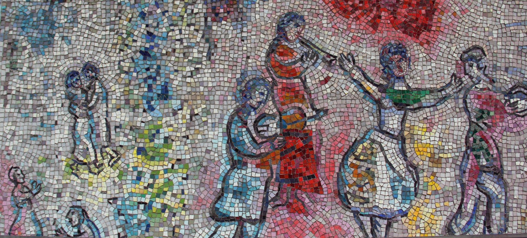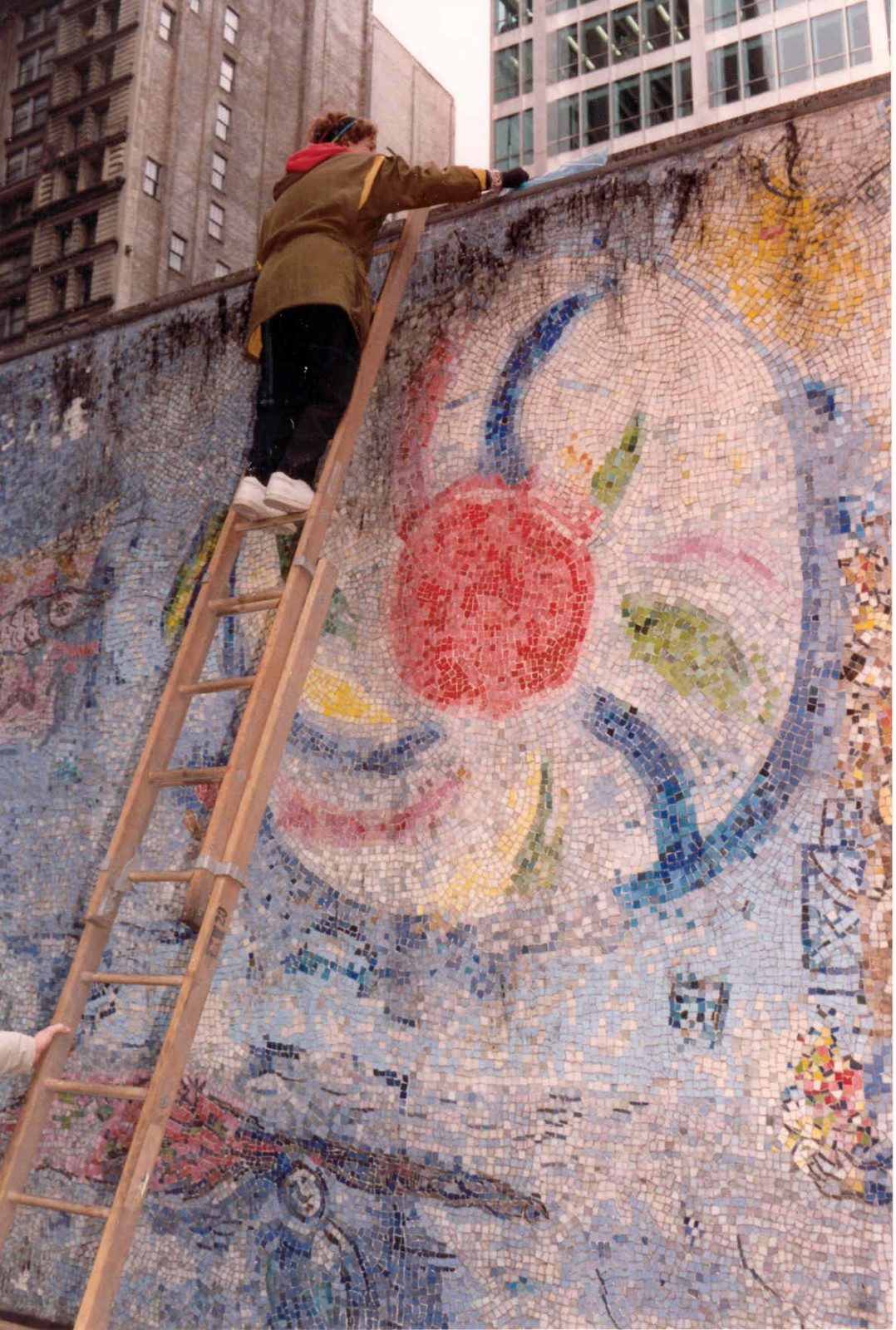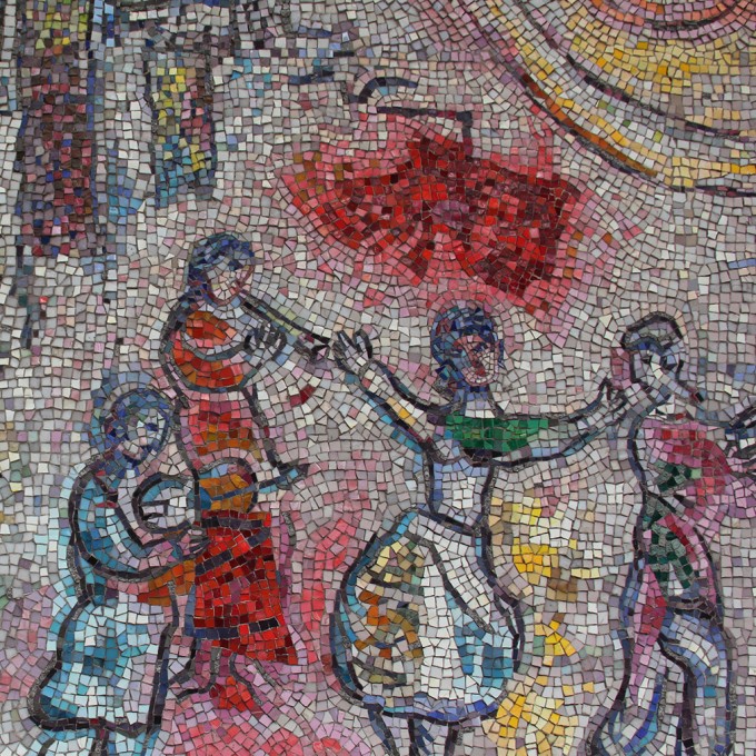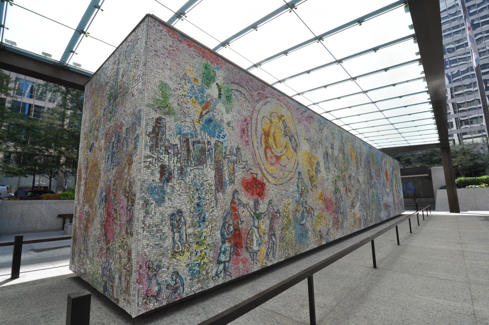 The mosaic "Les Quatre Saisons" (The Four Seasons), designed by the artist Marc Chagall, was completed in 1974. The mosaic covers the walls of a reinforced concrete vault structure that is approximately seventy feet long, ten feet wide, and fourteen feet high. The glass and ceramic tesserae mosaic are laid into the mortar setting bed on 128 precast concrete panels.