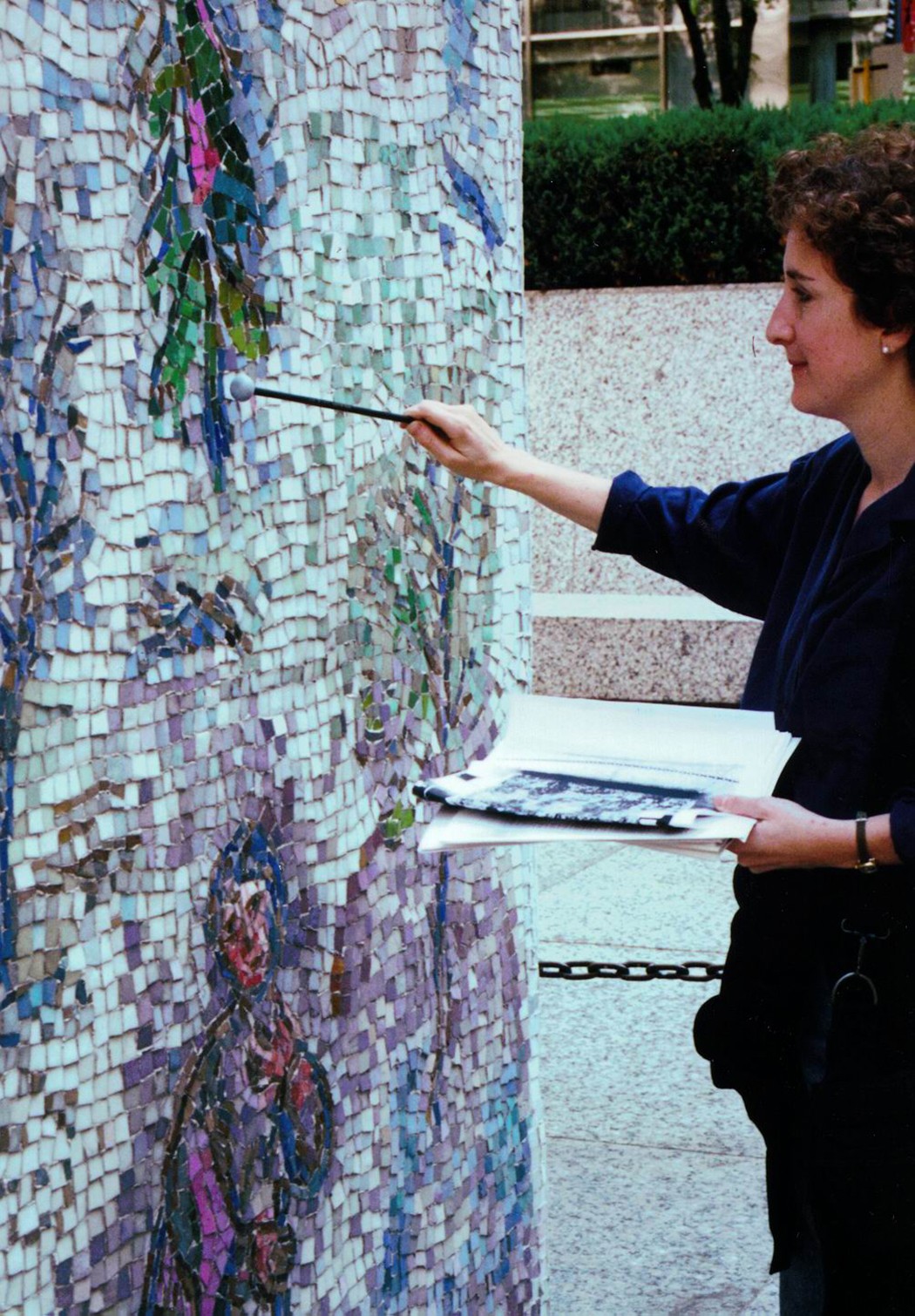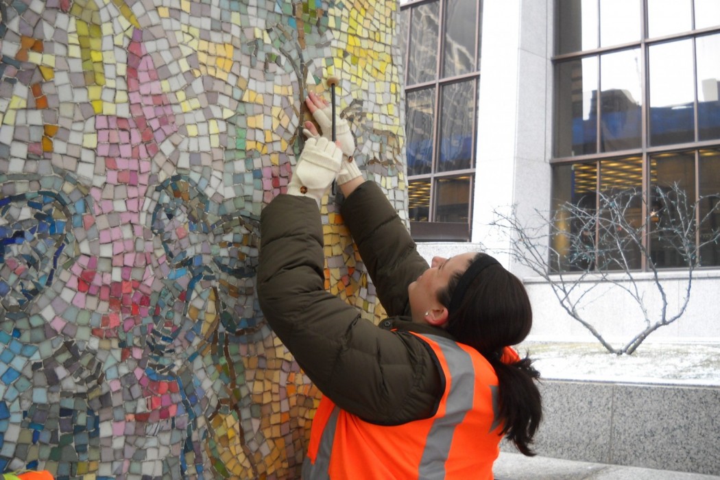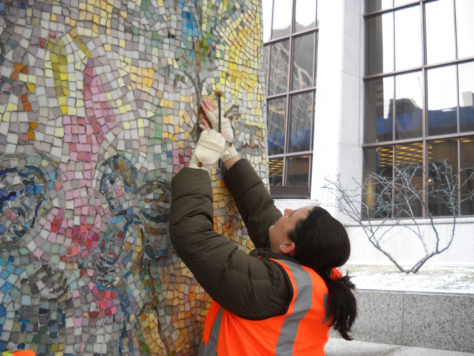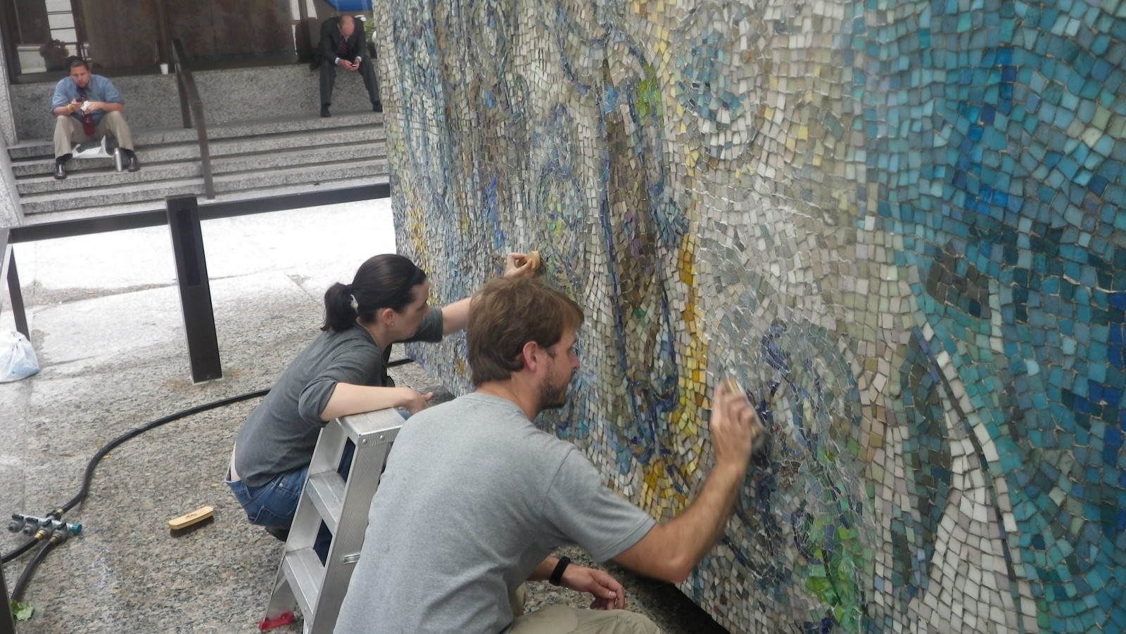 WJE removed the graffiti and cleaned the mosaic with a neutral pH, nonionic surfactant. Missing or damaged tesserae was replaced with new tesserae selected to best match the original shape and color. Where the bird deterrent system had detached from the granite copings, the posts were reattached with an adhesive.