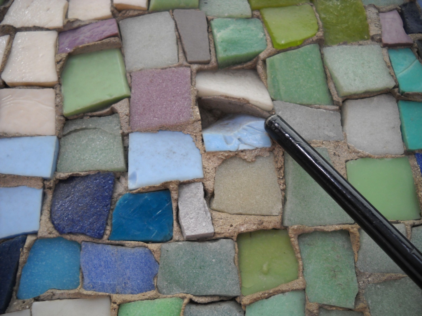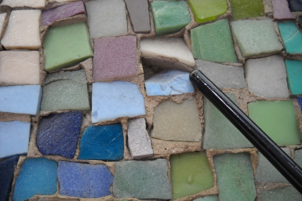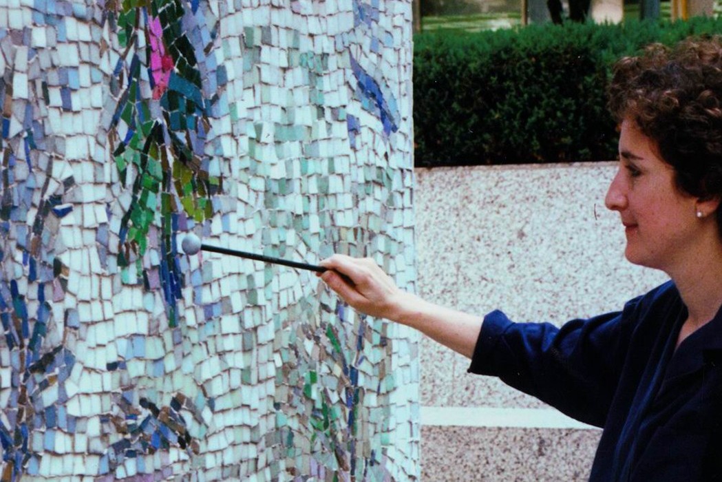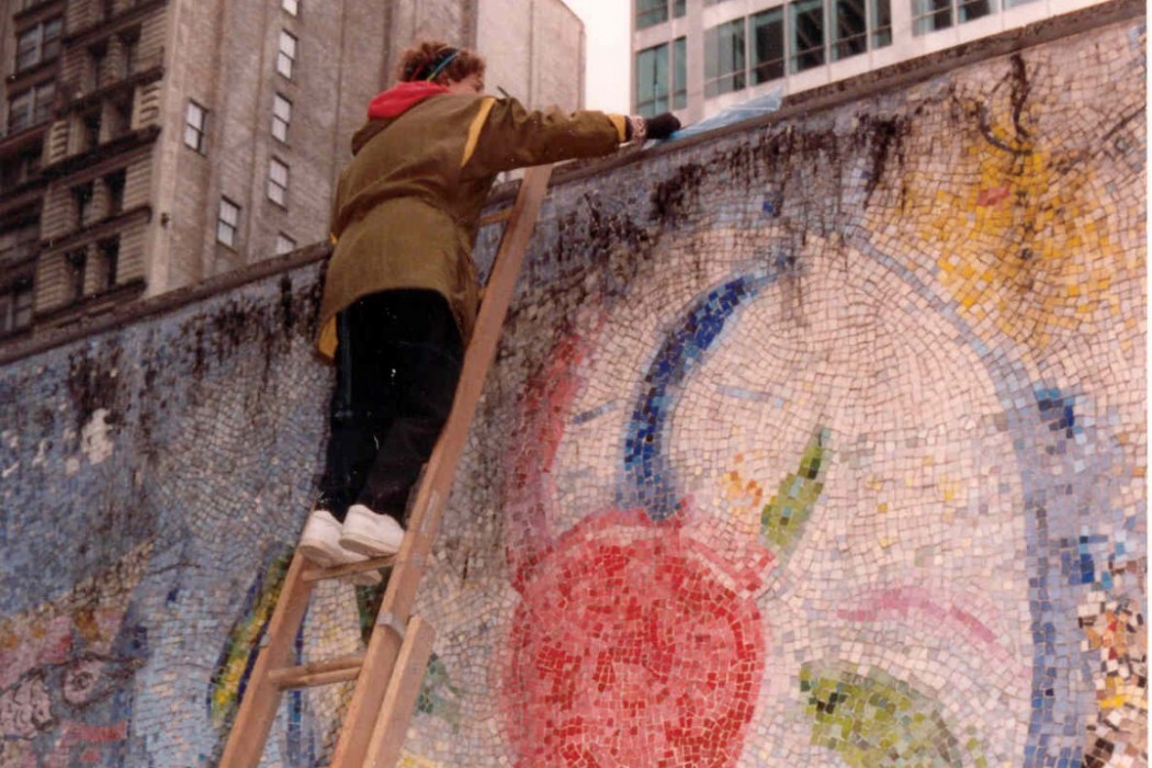 WJE removed the graffiti and cleaned the mosaic with a neutral pH, nonionic surfactant. Missing or damaged tesserae was replaced with new tesserae selected to best match the original shape and color. Where the bird deterrent system had detached from the granite copings, the posts were reattached with an adhesive.