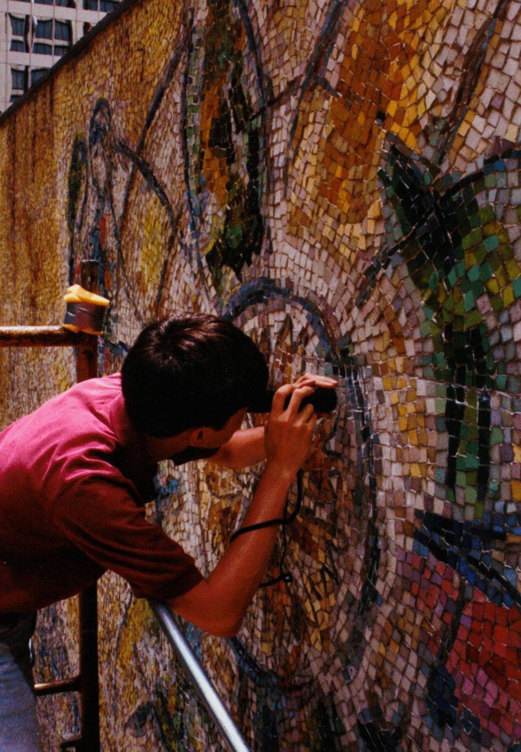 WJE performed a conservation assessment of the mosaic to detect areas of distress. Conditions were documented on photographic survey sheets. The inspection revealed light atmospheric soiling and other deposits, isolated instances of graffiti, loose or missing tesserae, cracking, and mismatched grout from previous conservation campaigns. Additionally, the bird deterrent system located on top of the mosaic was found to no longer be effective.