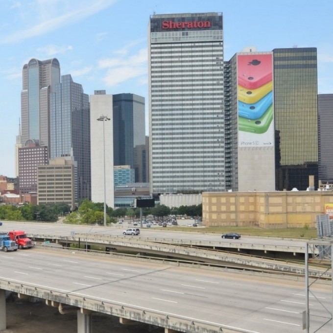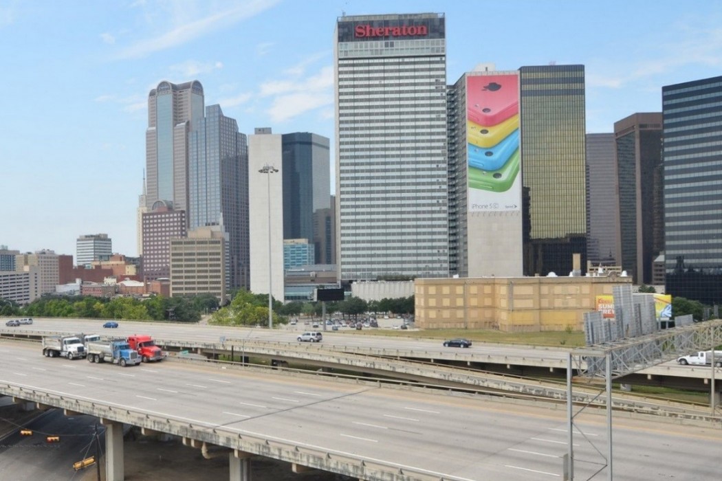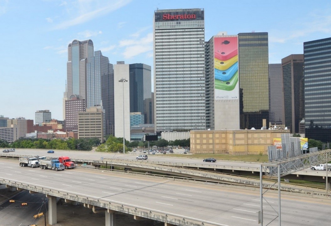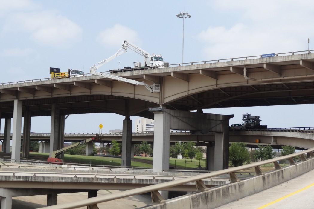 Completed in 1971, the 1.6-mile steel structure connects I-35, I-45, and US 75 with local city streets. Its sixty-five units typically consist of two welded plate girders in two to four continuous span units. Floor beams with cantilevers support a transversely and longitudinally post-tensioned (PT) concrete deck. The structure is primarily supported on individual concrete column piers, often offset to accommodate city roadways below.
