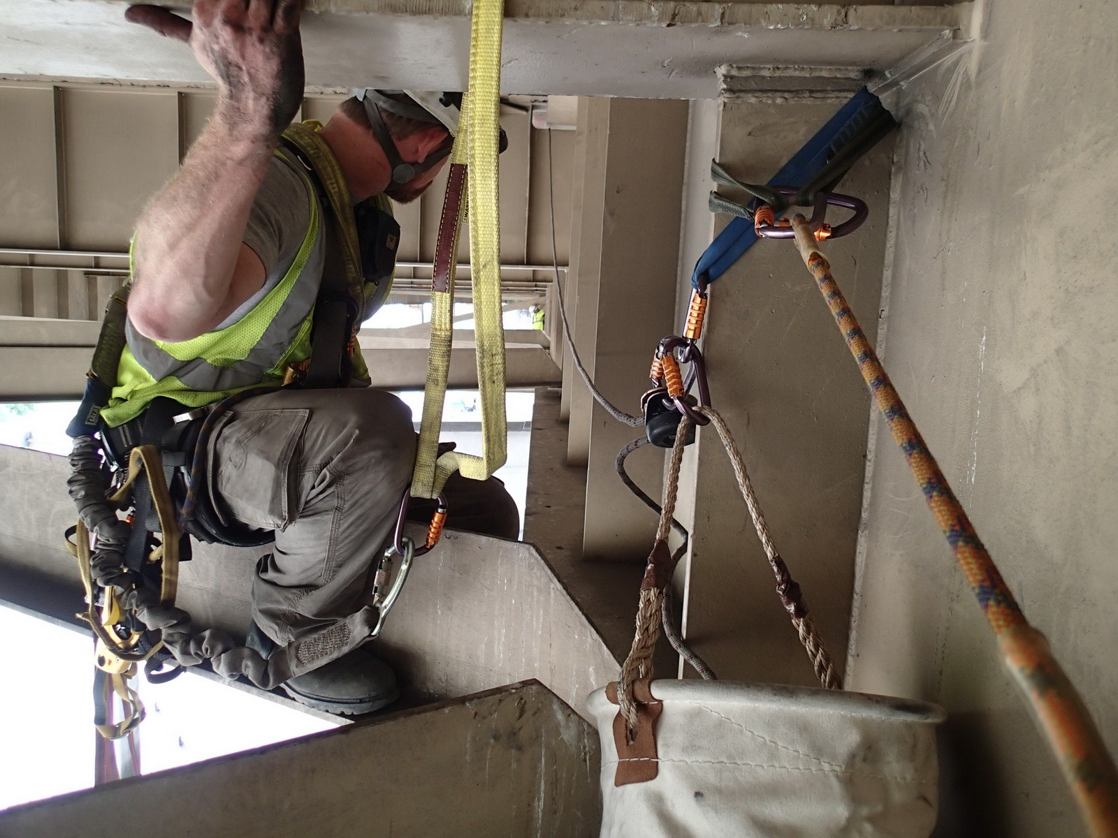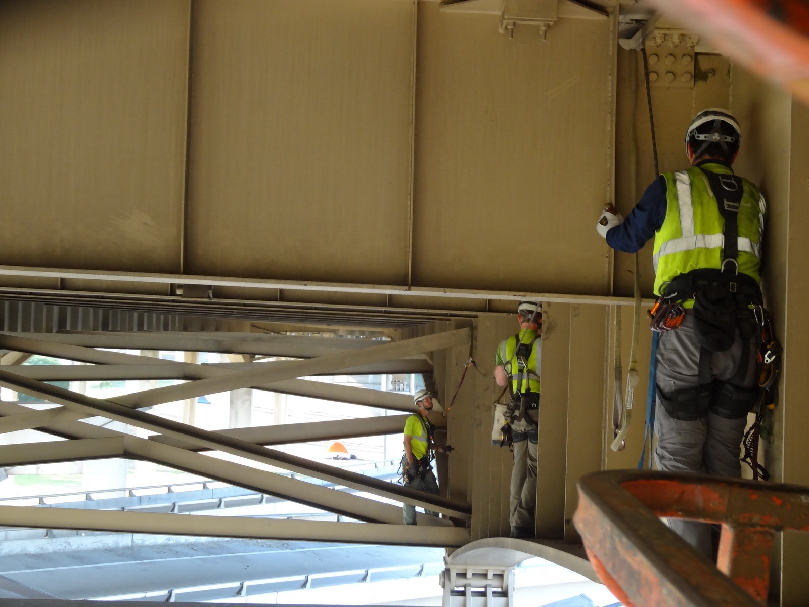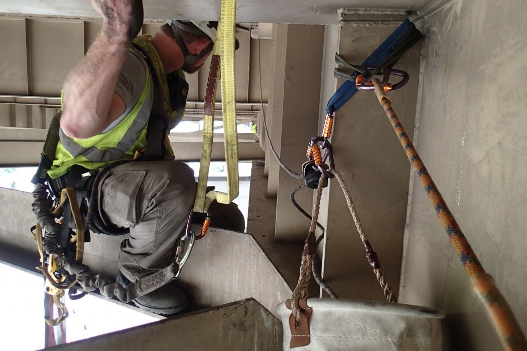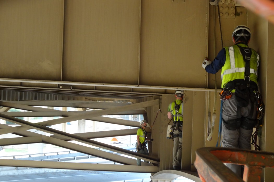 WJE utilized various access methods during the six-week condition assessment, including under-bridge inspection vehicles, aerial lifts, and technical rope access techniques. To efficiently collect field information, WJE's Plannotate data collection application was used. The tablet-based system allowed for information sharing at the site, at the office, and outside of WJE. Connection information, including previous inspection and retrofit data, were available to inspectors during their work. Using the interactive web-based software, WJE engineers reported their findings quickly and accurately, at times uploading up to 1,500 pictures a day.