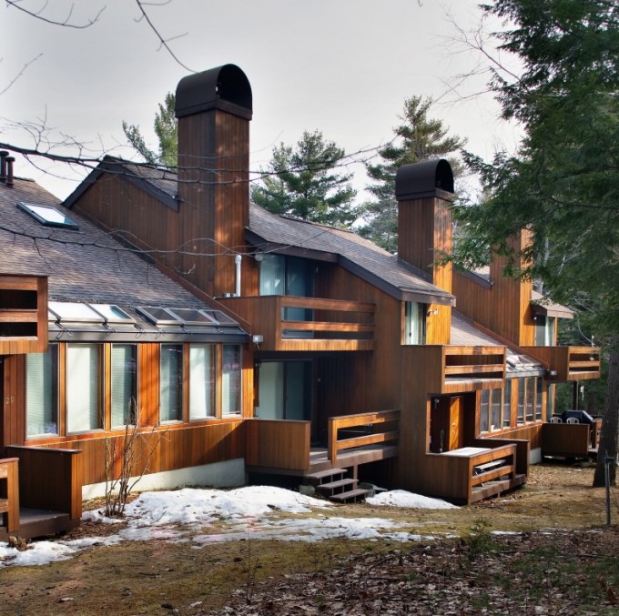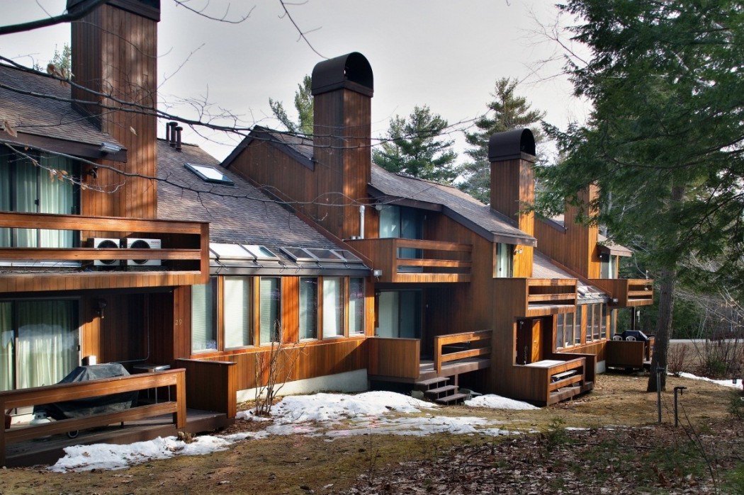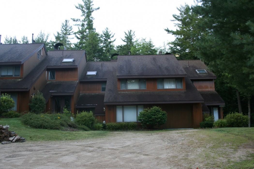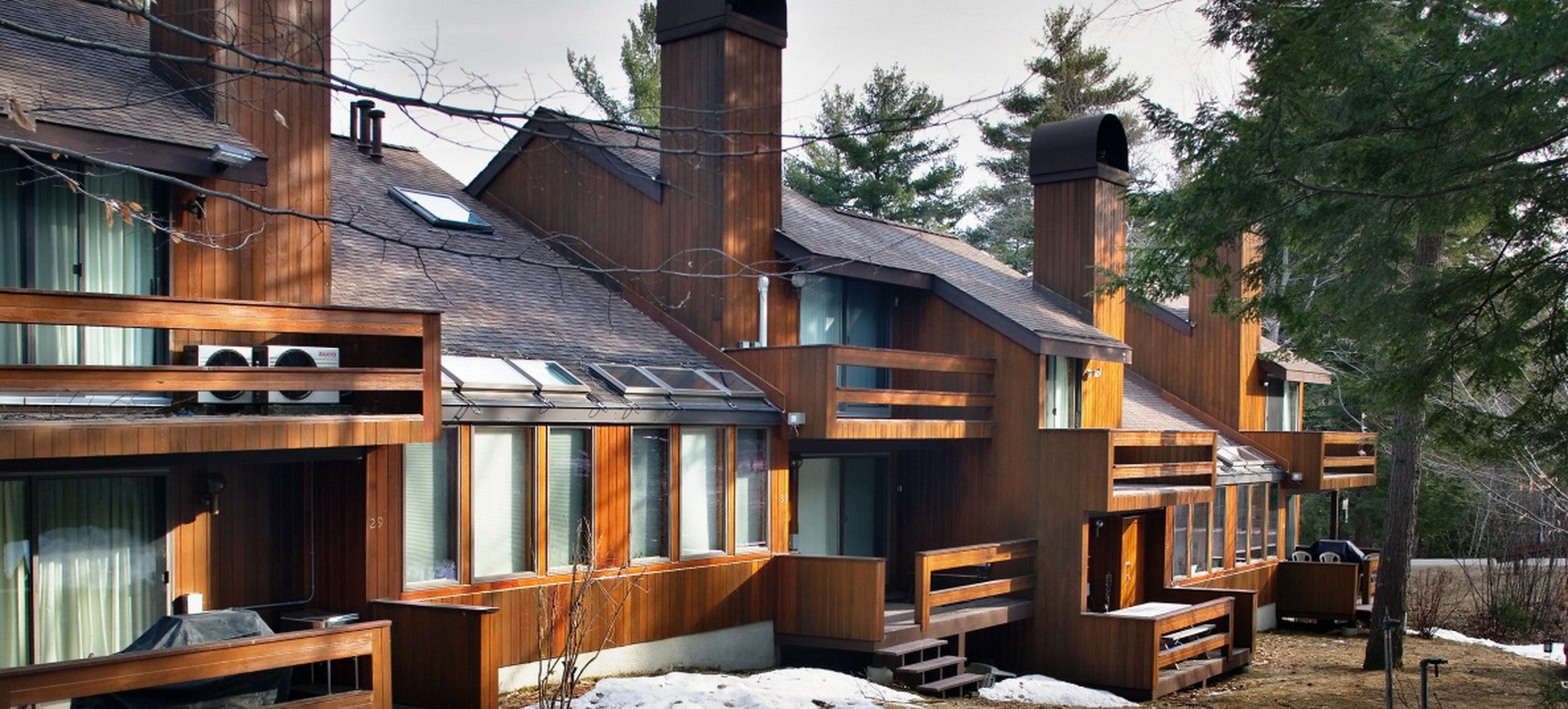 The Mountainside complex was built in 1985 and consists of sixty condominium units housed in nineteen separate buildings. The structures consist of either two-unit (duplex) or four-unit (quad) buildings. The buildings are located in the Attitash area of the White Mountains, along ski trails. The buildings are wood-framed structures with cedar siding and steep-sloped asphalt shingle roofs. Windows are a combination of fixed and sliding insulated glass. Each unit features a series of three tall glass windows in the dining area facing the ski slope. Above these windows are skylights or atrium windows. The units also contain individual skylights.