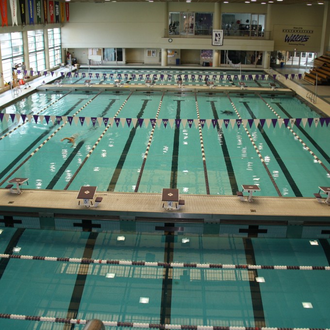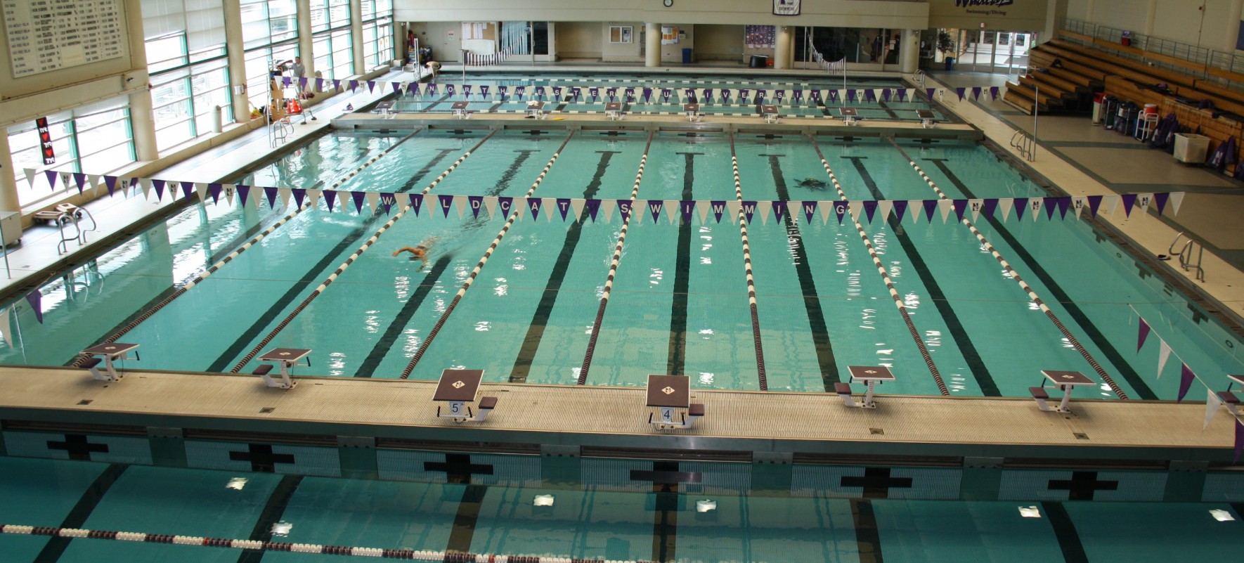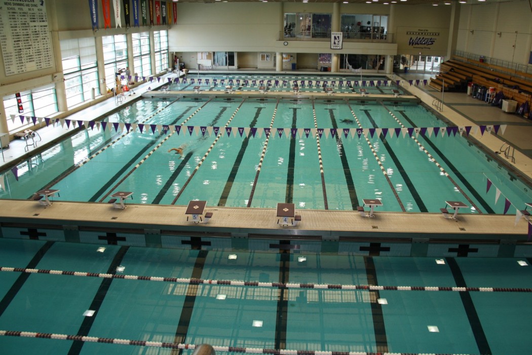 The Norris Center Olympic-size pool, with high dive towers on one end of the pool, consists of cast-in-place concrete foundations and walls and an at-ground level, cast-in-place concrete pool deck slab. The pool deck concrete is finished with ceramic tiles placed in mortar bedding over the waterproofing membrane; pool concrete walls and slabs are also finished with ceramic tiles set in mortar bed. Linear floor drains are set in the perimeter of the pool deck. Three underwater window openings are located in the pool walls. The structure's walls consist of steel columns covered with precast concrete panels and insulated precast wall panels on the exterior along the west, north and east elevations.