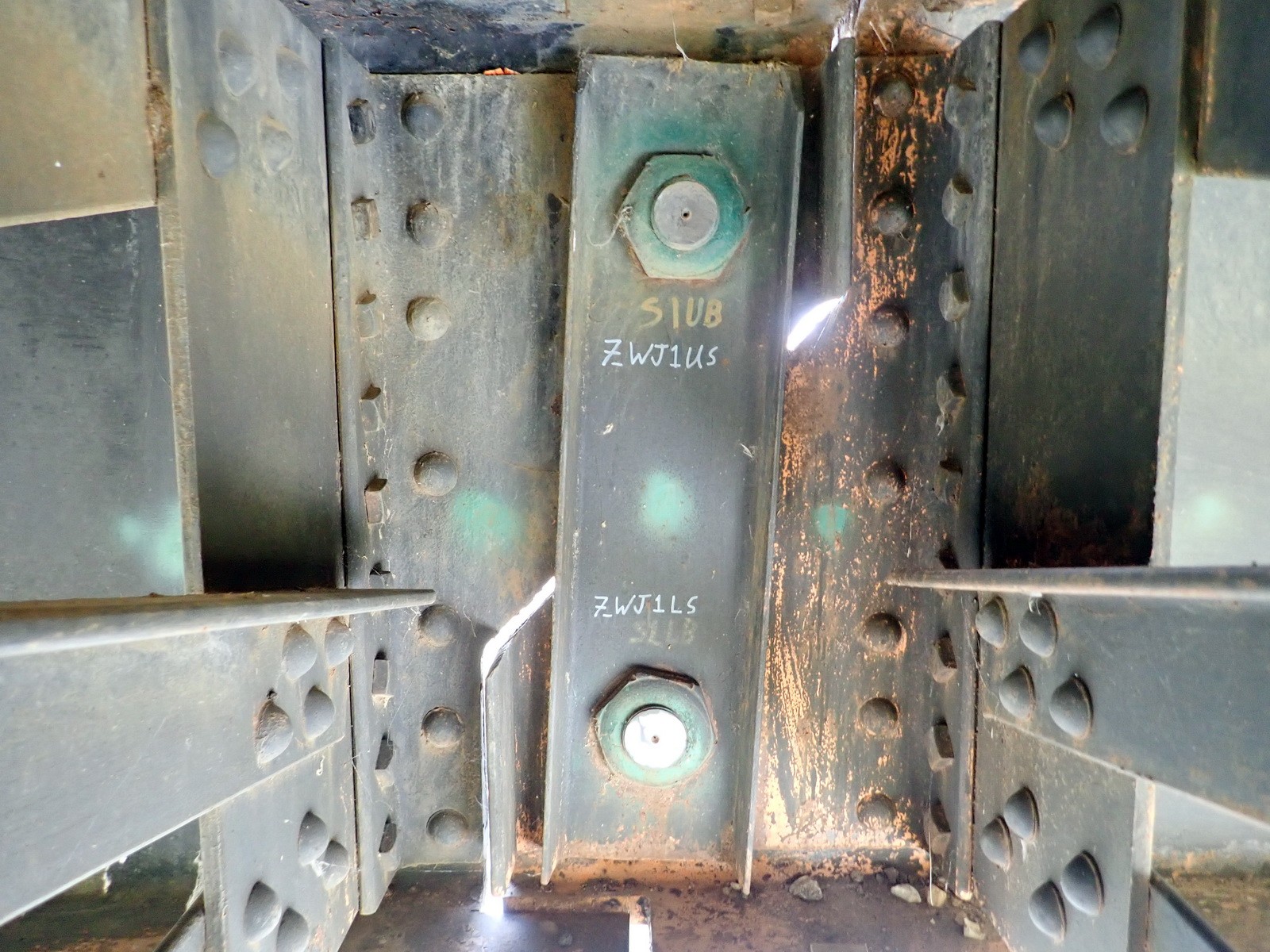 WJE was retained by NDDOT to perform a visual inspection and phased array ultrasonic testing (PAUT) on the pinned connections of seventeen bridges across the state—a total of 344 bridge pins in pinned hinge or pin and hanger connections. Components in the vicinity of the pin connections were examined visually at arm’s length, and connecting pins were subjected to ultrasonic testing using axially oriented scans. WJE team used ultrasonic scans to inspect the connecting pins, while arm’s- length examinations were used for evaluation of components in the vicinity of the pin connections.