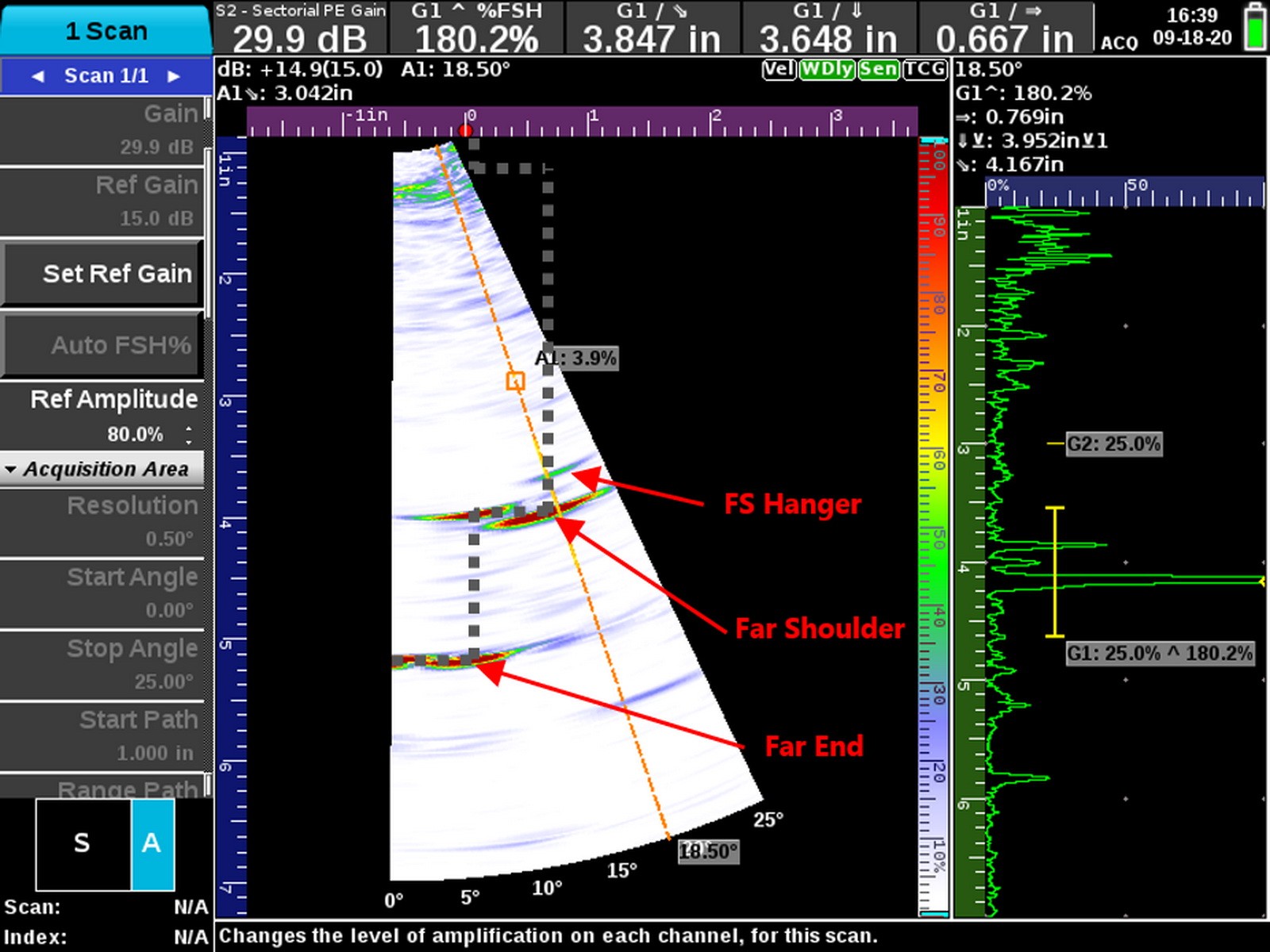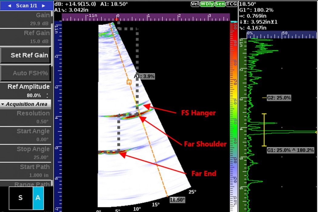 The WJE team, including an engineer who specializes in PAUT and an ANST Level III Ultrasonic Testing Inspector, accessed the pinned connections via a truck-mounted under-bridge inspection apparatus. Testing included PAUT scans using an angular range of 0°–25° from both ends of the pin. Lower scanning angles (approximately 0°–5°) were used to measure the total pin length and distance to the far shoulder, which was recorded for each pin end tested. The ultrasonic response from these geometric features demonstrated the axial continuity of each pin. The higher scanning angles (approximately 10°–25°) were used to assess the overall condition of the pin barrel surface.