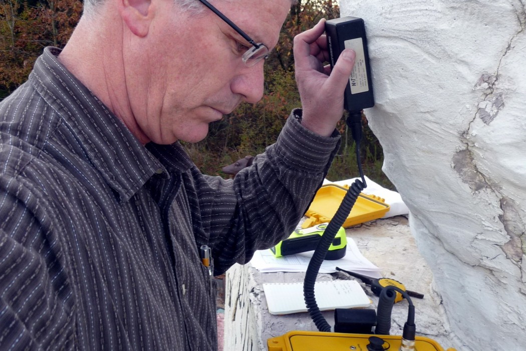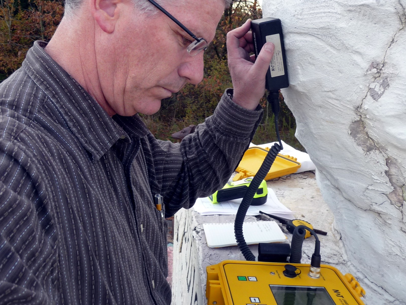 Careful sound testing and delamination surveys were conducted over the majority of the statue's surface to detect areas of subsurface cracking, delamination, spalling near joints, and deterioration of plaque areas caused by a combination of freeze-thaw damage and corrosion of embedded reinforcing steel. Limited microscopic laboratory studies were also conducted to characterize the concrete and observed deterioration.