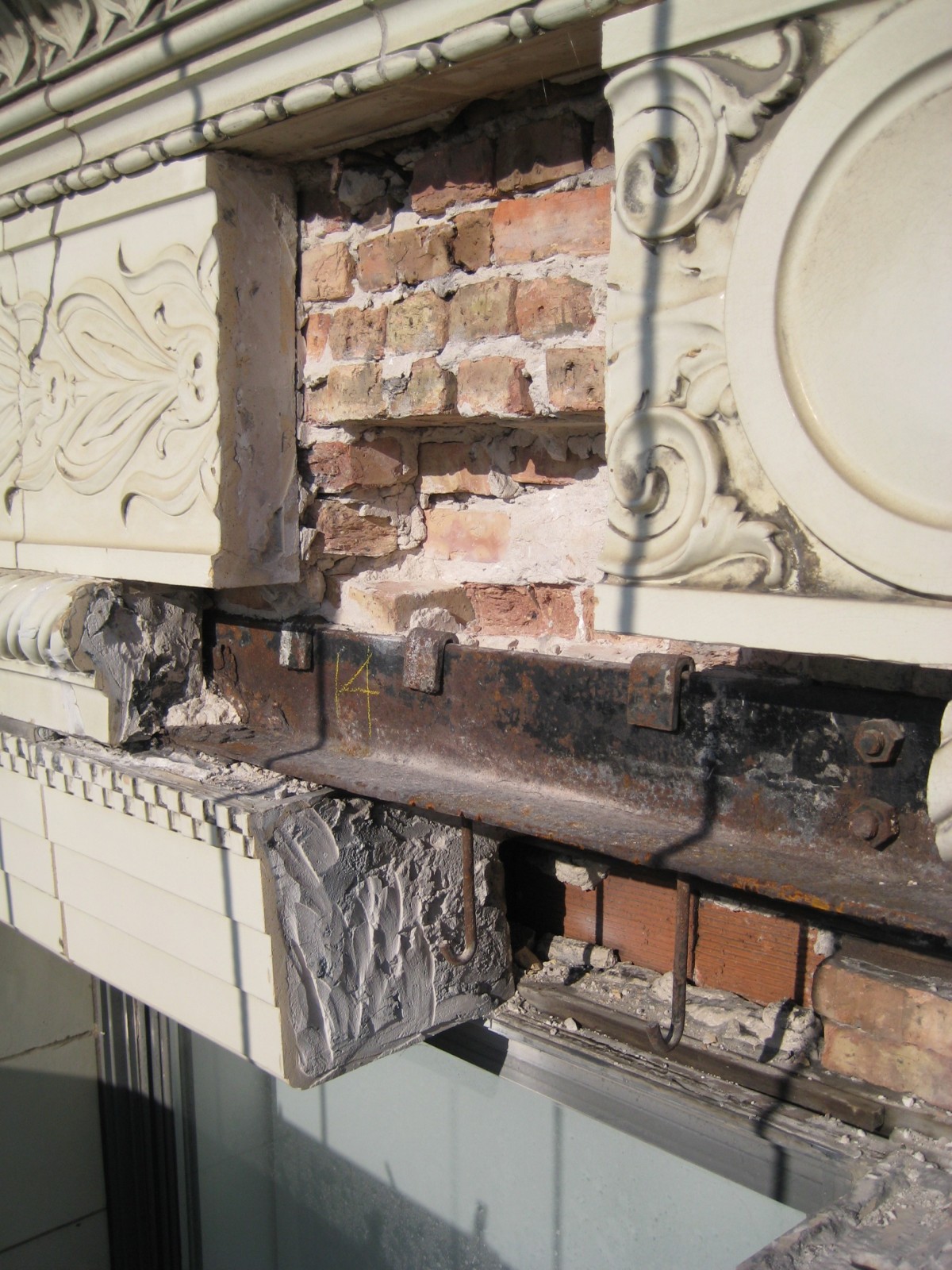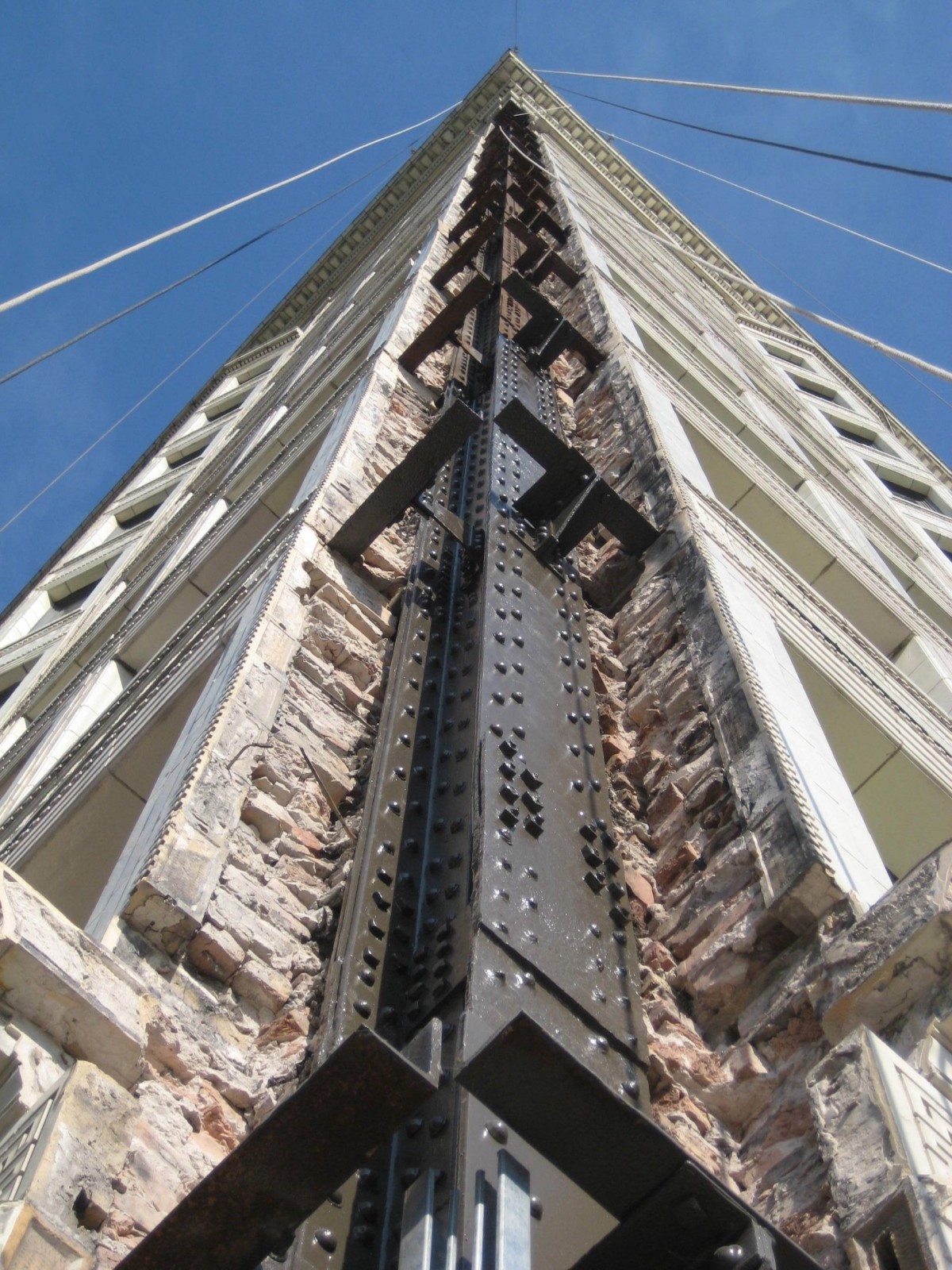 WJE masonry experts performed an inspection of the facade to evaluate potential causes of distress. During the initial inspection of the east and south facades, distressed terra cotta units were strapped as a precaution. WJE experts then performed in situ strain relief testing to assess the stresses within the terra cotta, which revealed that some load had been transferred between floors yet was not accumulating over the height of the building. WJE's repair consisted of pinning terra cotta units, replacement of cracked units, and cutting of relief joints to relieve stresses within the terra cotta units.