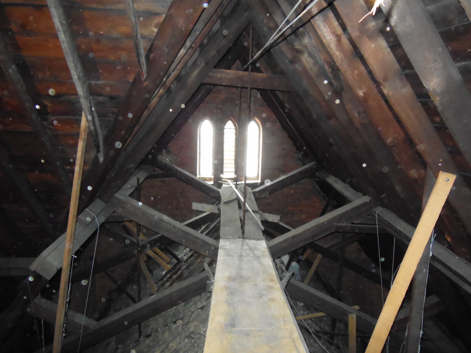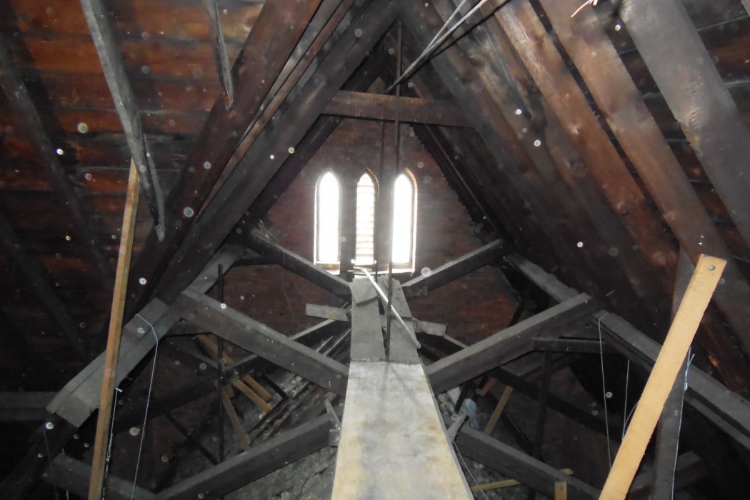 St. Mary, Mother of the Redeemer Church was constructed in the early 1890s. The church is cruciform-shaped in plan. The roof structure of the church consists of rough sawn lumber decking and purlins, heavy timber sub-purlins, and wood scissor trusses that are comprised of multiple rough sawn lumber laminations. The trusses bear on mass brick and sandstone masonry walls. A decorative plaster finished ceiling supported by light wood framing is suspended below the roof trusses.
