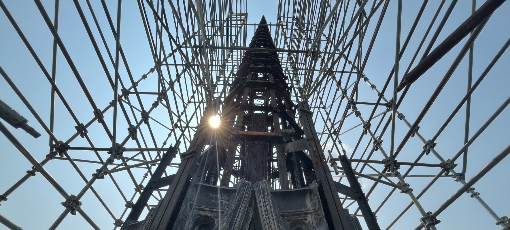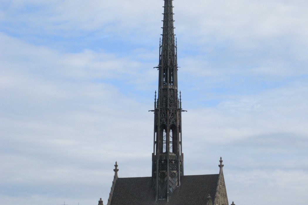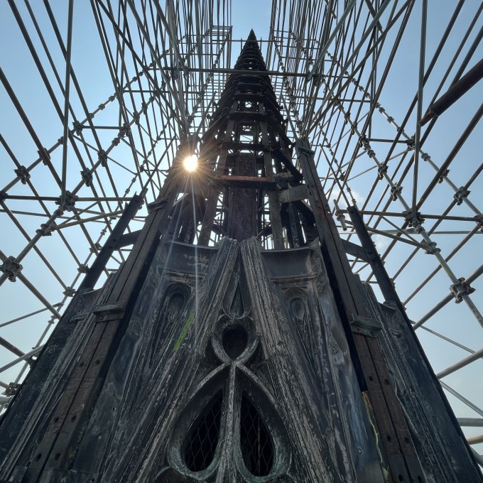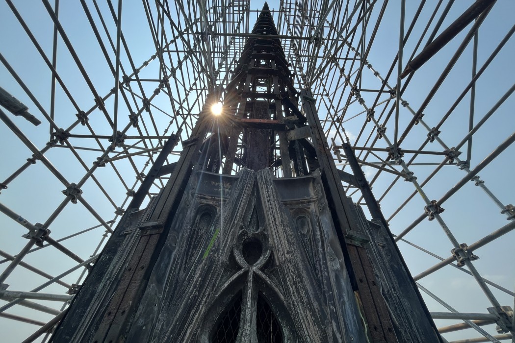 Following the identification of corrosion at the supporting steel armature of the fleche, WJE performed an extensive condition assessment of the structural system and the ornamental sheet metal cladding it supports. Full height scaffolding was installed to provide access, requiring the installation of new structural steel to reinforce the existing roof structure.